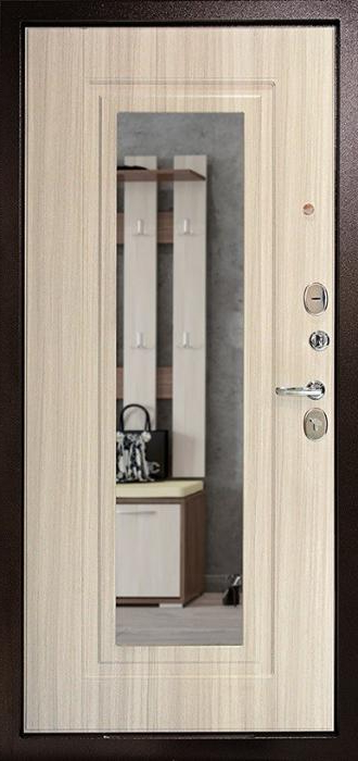 Прочный стальной каркас, лист металла толщиной 2 мм и система блокираторов делают эту модель надежным барьером для квартиры, офиса или частного дома. Внешняя поверхность покрыта молотковым напылением, устойчивым к механическим повреждениям и перепадам температуры, благодаря чему дверь сохраняет аккуратный вид долгие годы. Внутренняя накладка МДФ добавляет уюта и гармонично сочетается с интерьером прихожей. Зеркало на полотне выполняет не только декоративную функцию, но и делает пространство визуально шире. Зеленая входная дверь в квартиру №2 комплектуется двумя замками российских производителей — сувальдным Просам и цилиндровым Мосрентген, каждый из которых оснащён тремя ригелями. Два контура резинового уплотнения помогают минимизировать сквозняки и шум, а возможность выбрать сторону и тип открывания делает установку максимально удобной. При необходимости отделку, замки и дополнительные элементы можно адаптировать под индивидуальные требования. Зеленая входная дверь в квартиру №2 от производителя: быстрое изготовление и монтаж в Сергиевом Посаде, индивидуальные размеры, широкий выбор материалов и фурнитуры, официальная гарантия до 10 лет.