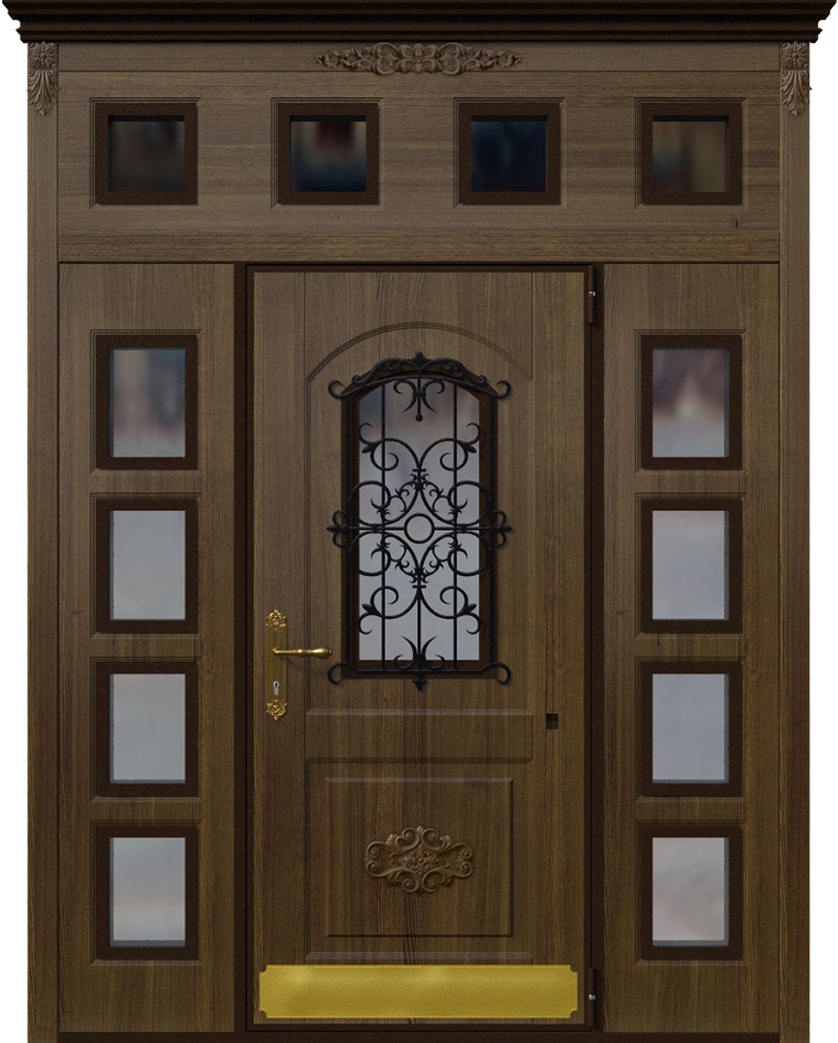 Эта модель выделяется своим масштабом и декоративностью: двухстворчатая дверь со вставками и ковкой №2 подчеркивает парадность входа и придает фасаду респектабельность. Основу составляет прочный каркас из стальных профильных труб с листом металла толщиной 2 мм и ребрами жесткости, что обеспечивает долговечность и защиту. Снаружи и внутри полотно облицовано накладками МДФ, которые позволяют воплотить различные варианты текстур и оттенков, сохраняя устойчивость к механическим повреждениям и влиянию внешней среды. Кованые элементы вносят в образ двери нотку изысканности и индивидуальности, делая ее центральным акцентом всего фасада. Для безопасности предусмотрены два замка турецкого производителя Kale Kilit — цилиндровый и сувальдный, каждый с ригелями, усиливающими защиту. Такая дверь сочетает надежность металлической конструкции с эстетикой классического дизайна, превращая вход в настоящий архитектурный акцент. Двухстворчатая дверь со вставками и ковкой №2 от производителя: быстрое изготовление и монтаж в Сергиевом Посаде, индивидуальные размеры, широкий выбор материалов и фурнитуры, официальная гарантия до 10 лет.